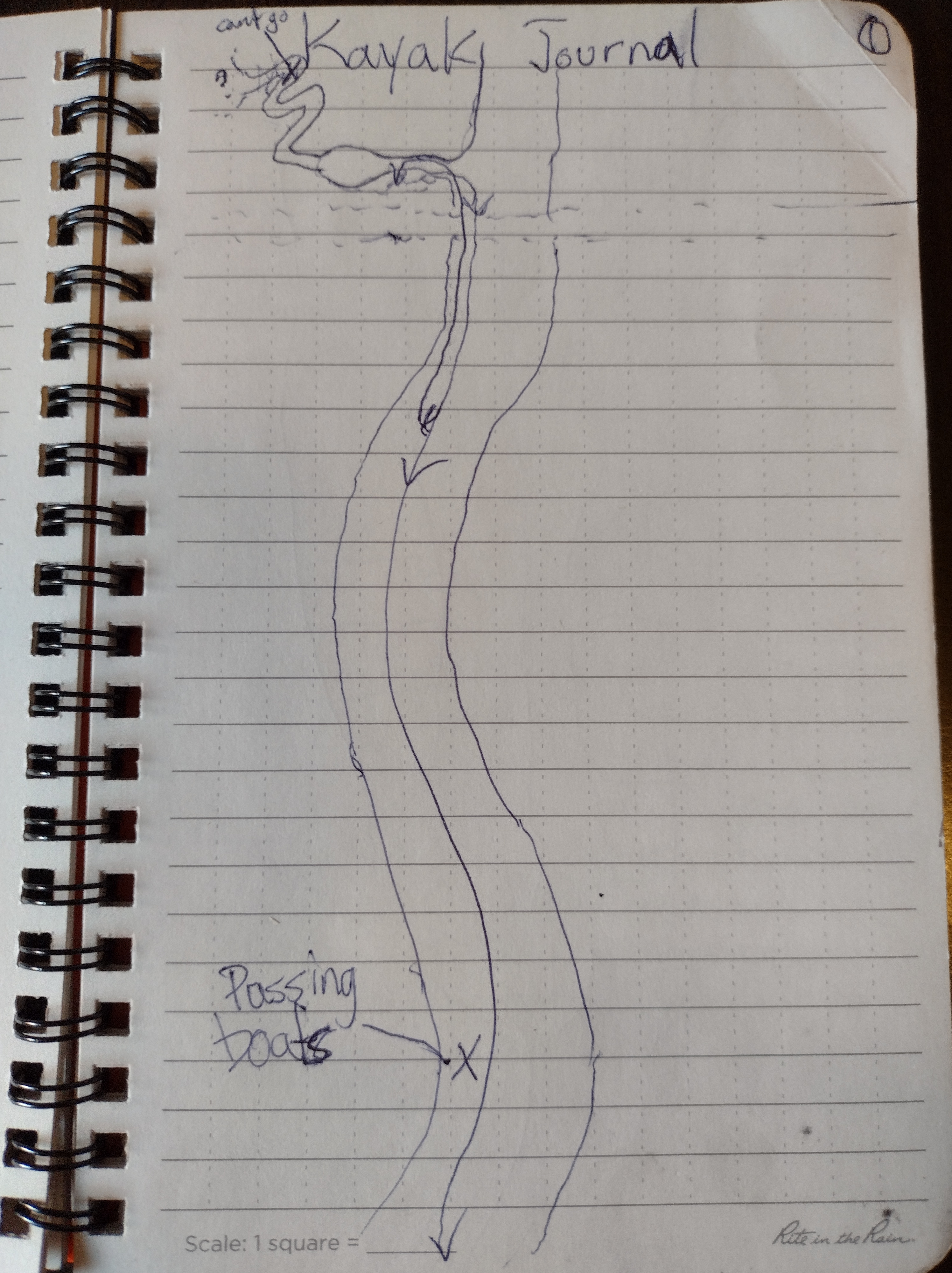 This is a kayaker’s journal, and a reflection on a reflection, again. The first page is a crudely drawn map, which continues onto the next.