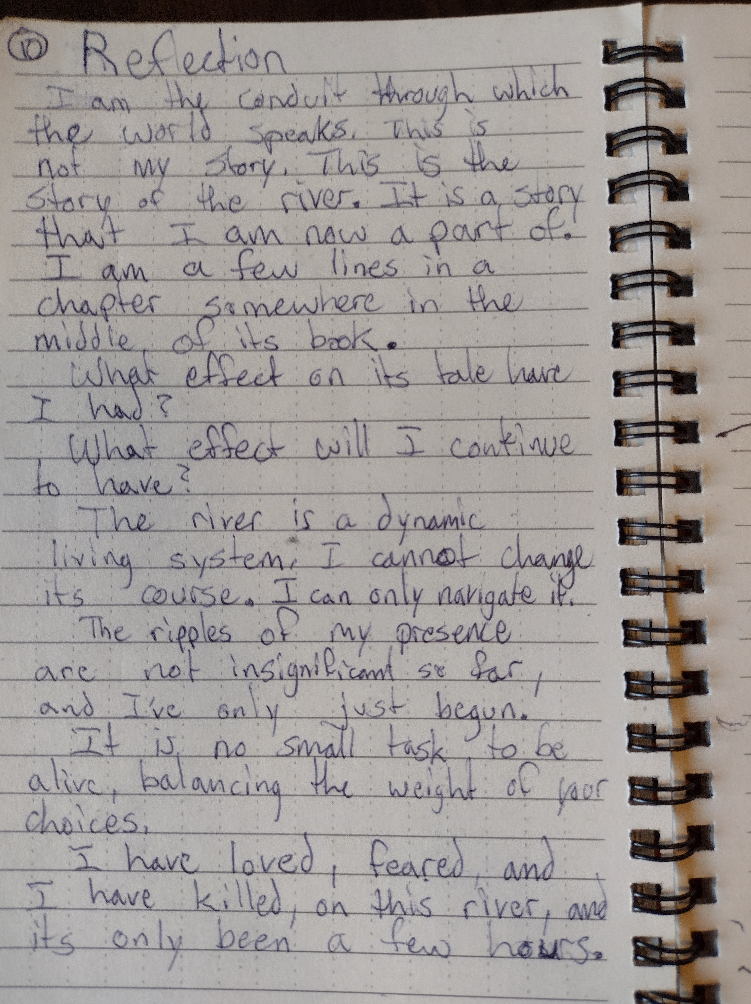 I learned that rivers are living systems, because everything alive in a river is fed by its flow, whether it be the trees and shrubs along the shore, or the water grass growing from one or two foot below some surfaces, birds, insects, and curious creatures I’ve not ever laid eyes on call that place home.
