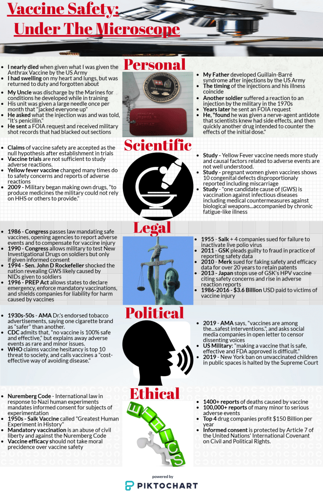 My life story represents important scientific evidence that there are problems with vaccine safety. I am one of many people to have suffered a serious adverse reaction to an injection, given to me by the military. In February of 2010 I had moved from BC, Canada to the USA and joined the Washington State Army National Guard. I excelled in training and afterwards, volunteered to deploy overseas. In July of 2011 I was mobilized to a combat zone on a base in Mississippi where, as per Army Regulation 40-562(1), I was told I was being given two injections including the anthrax vaccine.